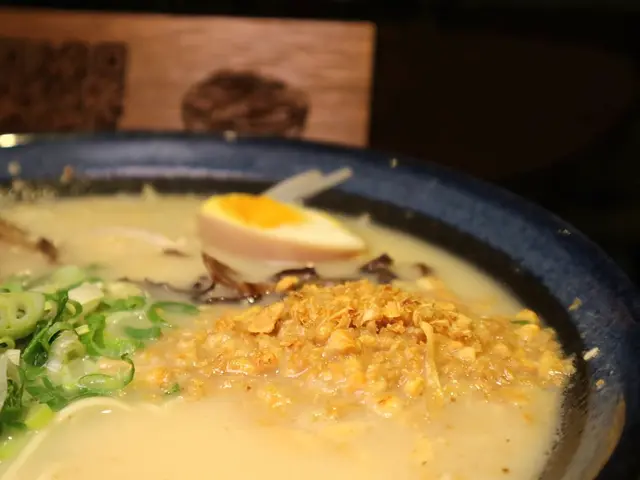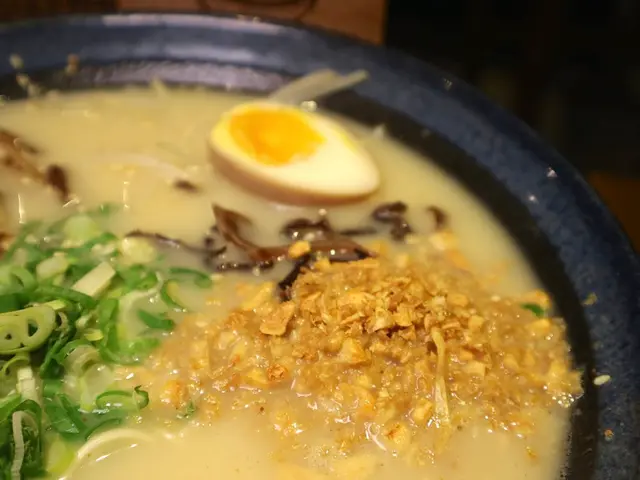 浸泡湯汁後蒜酥變軟,香蒜的味道也會融合入豚骨湯中!