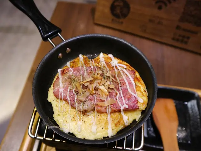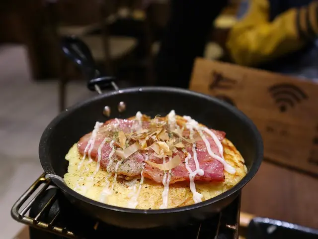 3.把火腿肉片擺放上去,淋上美乃滋醬,擺上柴魚片,就大功告成囉!