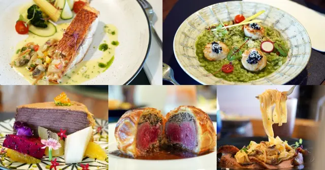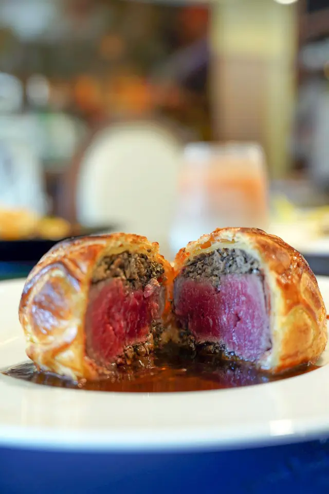 ▼威靈頓牛排,經典的英式料理,金黃可口的外層酥脆派皮,切開的那一刻,包裹著蕈菇碎鴨肝與粉嫩的菲力牛排,搭配一旁以松露、紅酒、牛骨熬煮的香醇醬汁,每一口都是多層次的享受,絕對是許多老饕的最愛!