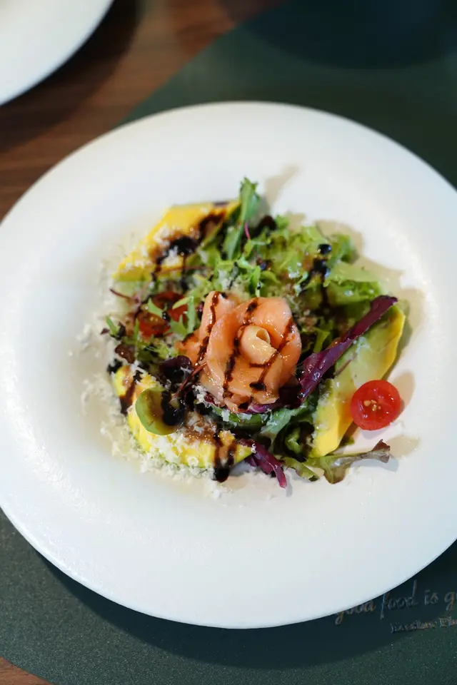 ▼酪梨燻鮭魚沙拉,當季酪梨滑順綿密、燻鮭魚鹹香濃郁,搭配醇酸的巴薩米克醋,清爽開胃,是開啟味蕾的好選擇。