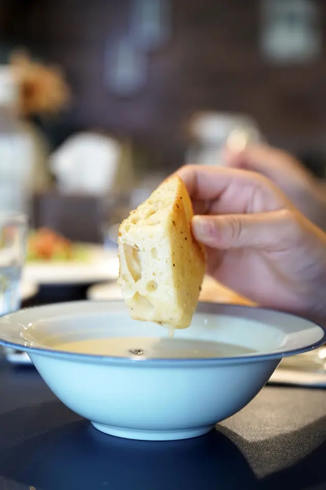 ▼外酥內軟的佛卡夏麵包,搭配香草和初榨橄欖油。拖鞋麵包則有著獨特的嚼勁,非常適合搭配濃湯。