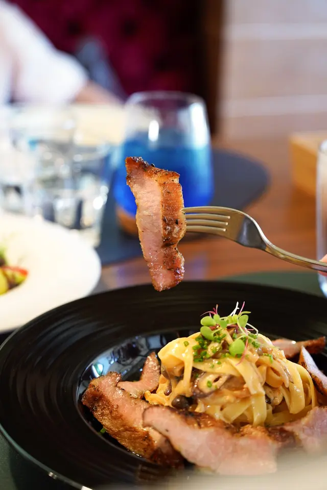 ▼腐乳松板豬寬扁麵,這道融合了中西風味的義大利麵料理,實在太令人驚艷了!豆腐乳與紹興酒炒製的鳥巢寬扁麵吸附了滿滿醬汁,搭配外酥內嫩特殊香料烤製的松阪豬,味道香濃獨特,推薦給喜歡嚐鮮的人,值得一試!