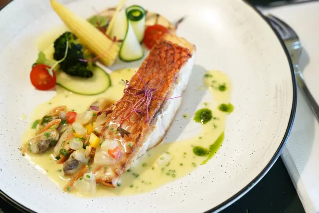 ▼馬告香料烤魚,這道是充滿台灣在地風味的料理,使用長尾烏(俗稱海雞公),以原住民常用的馬告胡椒醃漬調味在與奶油一起烤製,馬告的獨有香氣與海魚的鮮嫩多汁完美融合在一起,再搭配一旁的海瓜子檸檬法式奶油醬,風味獨特又顯清爽,每一口都是嗅覺與味覺的饗宴!