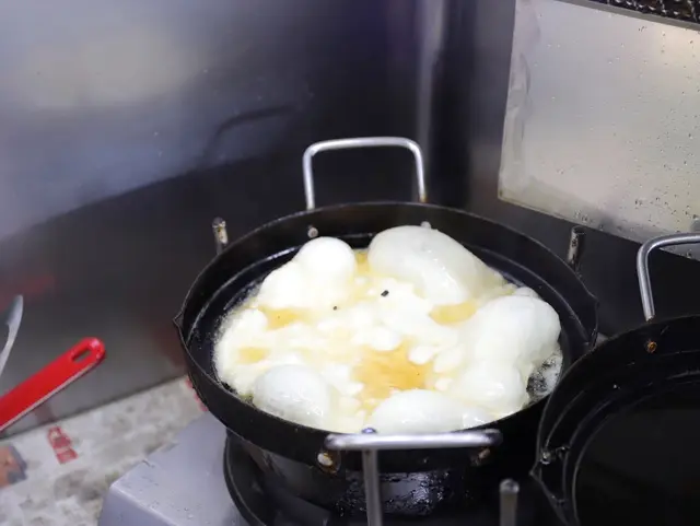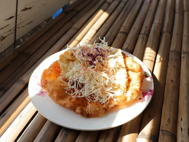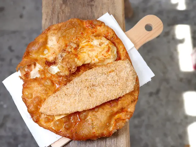 油炸的 金黃酥脆,上面是一顆半熟蛋