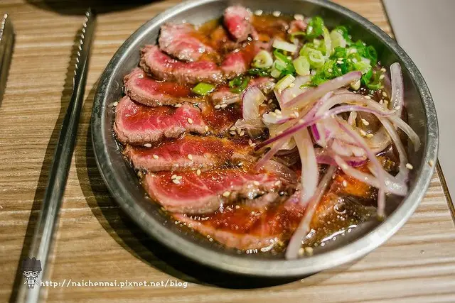 炙燒一分熟左右,可以直接吃,搭配洋蔥&蔥花吃