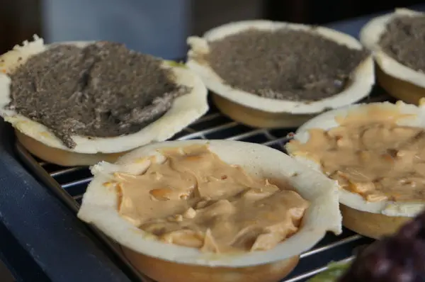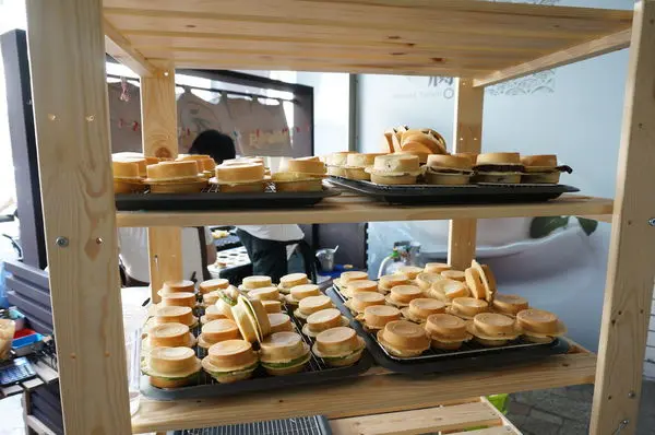 老闆把一邊餅皮做好後會放到架子上再擠上內餡