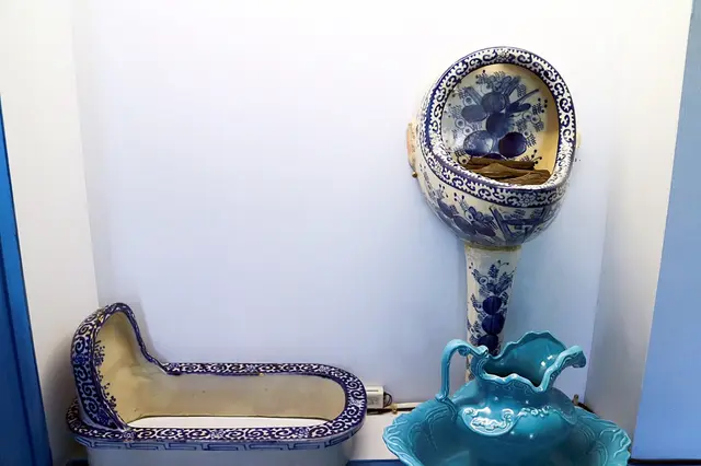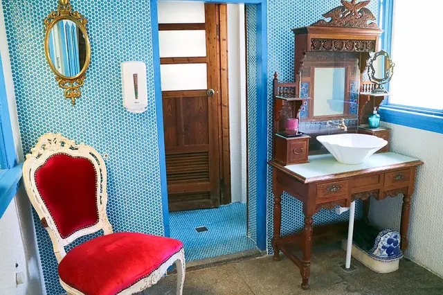 廁所也是很有特色,裡頭還擺放了舊式的馬桶和男性使用小便桶