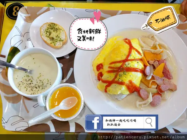 比起我平常外訂便當的蛋包飯來說,【遇見果香芒果冰】家的吃起來的感覺不油膩,食材配料也是我愛吃的!大方的老闆為了怕客人吃不飽,套餐裡不只有主餐和湯品,還搭配了蒜香法國麵包片和芒果凍… oh~~超滿足的!(這時候一定要感謝一下老闆娘額外招待我喝一碗濃湯,真的大感謝!)