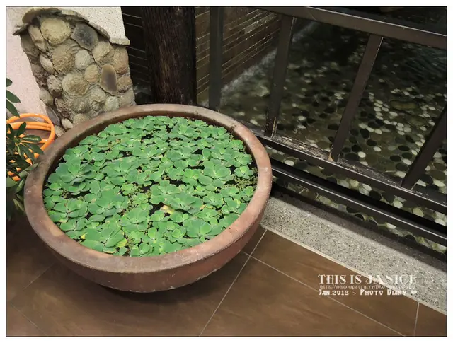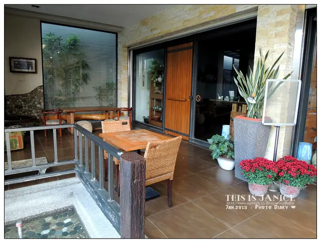 走進大門,木製傢俱、藤椅、水池、木頭地方
