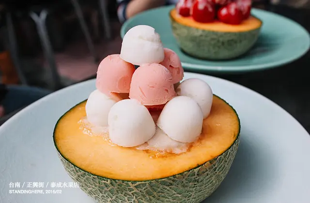 用半顆網狀哈密瓜搭配自製水果冰淇淋和冰沙, 超受歡迎!