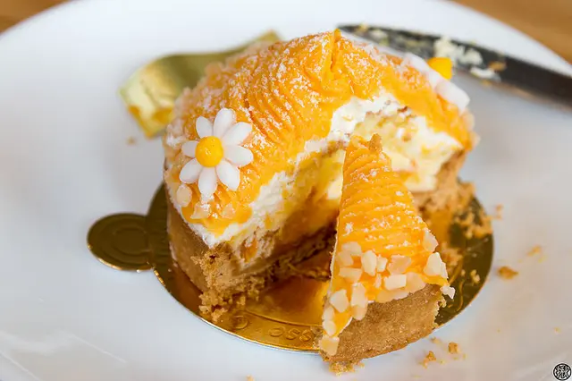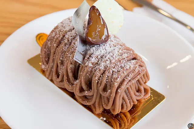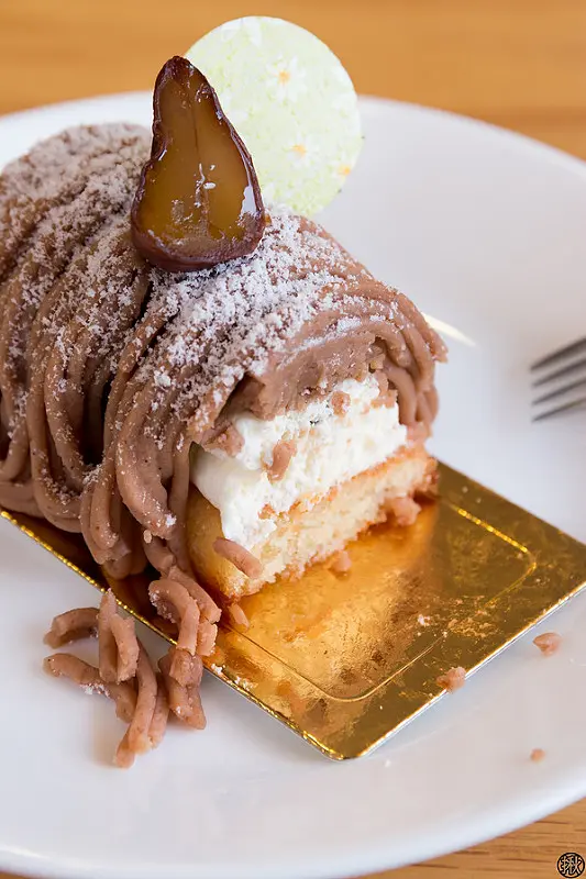 若沒記錯的話,這是第一次吃蒙布朗栗子蛋糕,可是味道卻跟我想像的差不多。蛋糕的表面擠滿栗子泥,放上一粒蜜漬過的栗子,雖然有加萊姆酒,但比例相當低,幾乎吃不出來。