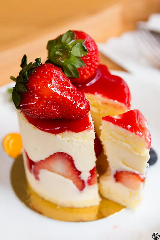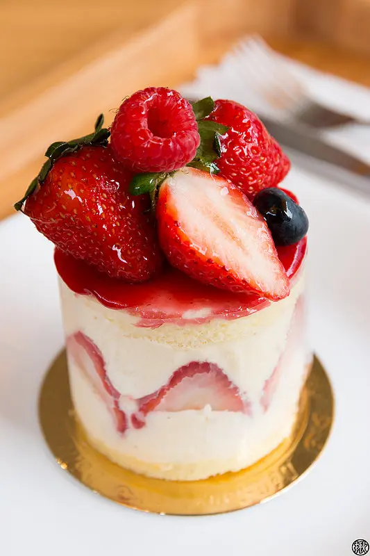 上面擺著幾顆完整的草莓、覆盆子及藍莓,中間抹上一層草莓醬,吃得出奶油的等級不差,草莓甜度一般,但以這價位來說算是不錯,可惜草莓季早已結束,想吃就得再等一陣子。