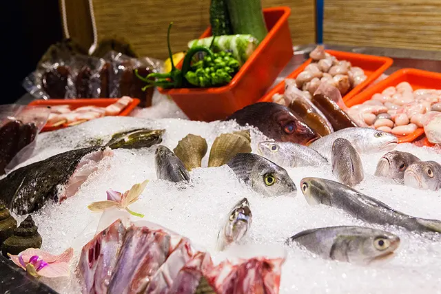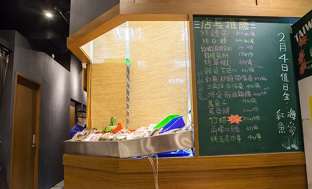小黑板旁是店內擺的新鮮魚貨以及蔬菜
