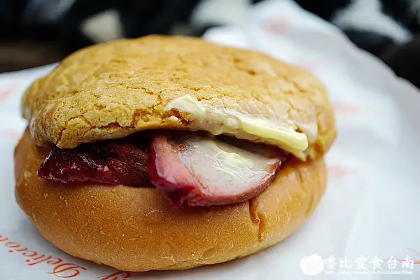 外層烤的酥酥的,不要太大力觸碰容易掉屑屑,奶油滑出來所以看起來邊緣油油的,奶油看起來很厚但其實只有半塊?沒辦法鋪滿整個波蘿麵包,後半部的波蘿麵包幾乎沒有奶油,沒有夾到奶油的部分感覺會比較乾,嚕比拿到後怕因為路程奶油會整個消失,先吃了一口,覺得外面酥酥的吃起來蓬鬆有咬感,冷了會變比較硬比較紮實略乾一些,嚕比喜歡有咬感的波蘿麵包,所以對嚕比來說算不錯吃。