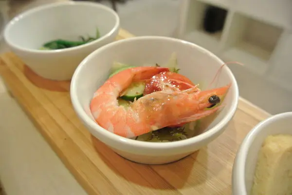 我們點兩份套餐~除了中間的鮮蝦沙拉不變~其它兩道小菜則有做更換