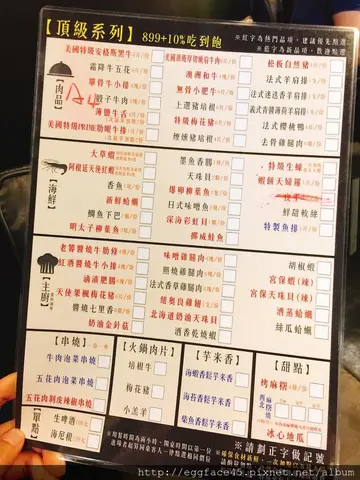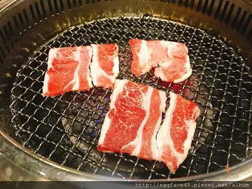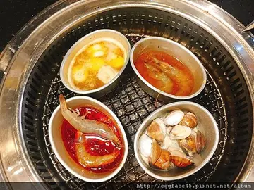 好久沒有吃過"吃到飽"的燒烤和鍋物了~今天來到桃園的「御燒原味無煙燒烤」,來體驗回味一下學生時期最喜愛的燒烤吃到飽餐廳。    御燒原味無煙燒烤,位於桃園市中正路上,臨近桃園市慈文國中和藝文特區,地點很好找,開車來的朋友也不用擔心停車問題,路邊有停車格,附近也有特約停車場(消費折抵1小時)。   店內非常寬敞,座位總共有128個,也有二間包廂,可分別容納12~24人使用,這餐廳的空間很適合團體聚餐或大型聚會同樂呢!   這裡的裝潢以黑色系為主,並搭配金色的燈飾,有一種低調的奢華感。牆面還放置肉品、美食的圖片,令人食慾大開啊!!   這裡用餐價位有三種,分別為599、699、899(服務費10﹪另計)我們今天體驗的是【頂級系列】899+10﹪吃到飽,可以點選的菜單如下 ↓↓↓   【醬料區】採自助式,有醬油、辣油、蔥花…等,非常多種類可自由選擇調配。   【沙拉吧】也是採自助式的,有玉米、苜蓿芽、美生菜、葡萄乾…等。 【飲料區】有汽水、咖啡、果汁、冰沙…等可選擇,想喝什麼就拿什麼!!    桌子上有二個爐子,一邊是火鍋,一邊是烤爐,當我們坐定位後,服務生就會先幫忙在火鍋裡放上基本配料,再將裝有各式火鍋料的餐車推出,讓我們選擇想吃的火鍋食材,火鍋的湯頭是用蔬果熬煮的,所以喝起來帶有清甜感。      火鍋料的種類超多,其中一個推車放的是基本的青菜、各式菇類、玉米…等。     另一推車則是放各式的火鍋料,有丸類、餃類、豆皮、王子麵…等。只要告訴服務人員想吃的配料,他們都會幫忙夾給你! 介紹了這麼多,終於來到重頭戲了!!最期待的肉盤總算出現了~~此行之目的就是要吃燒肉飽的不要不要的啊~滿滿的肉品和海鮮就如同被放在盤上的藝術品,等著我將它們都解決掉!!!      桌上放著四種適合燒肉使用的調味粉,分別是七味唐辛粉、孜然粉、胡椒鹽、玫瑰鹽,可依喜好自由使用,只不過,蛋寶還是最愛鹽味原味!!   【薄鹽牛舌】平日吃燒烤時,也喜歡點一份牛舌來吃!其軟脆的口感常令人難忘啊~薄片狀的牛舌,經過燒烤逼出油脂後,香味逼人,沾上一點點玫瑰鹽提味就很足夠了。只是這份牛舌烤得過熟了~變得較有嚼勁,若不怕生一點的朋友,可試試5分熟~更能嚐到其軟嫩感!      【美國特級prime肋眼牛排】美國特級prime肋眼牛排送來時為完整的一塊,厚度約1公分,上桌時已先幫忙分切成好食用的份量。整塊牛排放到烤網上,感覺好滿足,肋眼牛排油脂較為豐富,咬下時較為多汁,軟嫩中帶點咬勁~推!     【松板自然豬】、【照燒雞腿肉】松板豬烤到焦脆的口感也是我的最愛,只可惜服務人員烤的還不夠久~~所以,肉質的口感較偏軟嫩,但依然可以吃到肉的多汁香甜~推! 照燒雞腿肉已先用特製的照燒醬醃過,雞肉柔軟多汁,口味吃起來甜甜鹹鹹的,很不錯呢!大推!   這是我們今天的服務人員~服務超好也很細心呢!會告知我們肉品的特色,還有推薦的品項,也會隨時更換乾淨的烤網,讓我們吃的安心,重點是還全程幫我們服務~~超貼心!這是因為我們是平日中午用餐,服務人員才較有空幫忙協助,但平常用餐人數較多時,他們也會適情況幫忙哦!!  這個拼盤放了三種不同的肉品,從左到右分別是單骨牛小排、澳洲和牛、安格斯黑牛,以下會分別介紹其口感~(請耐心等待)   【單骨牛小排】單骨牛小排是採厚切的方式,可同時吃到筋和肉的雙重美味~但相對的也較有嚼勁!!這牛小排因有厚度,所以燒烤的時間較為久,整體的肉質吃起來乾柴~很難咬~載牙套中的姐姐完全咬不動,無法吃啊!!只好要求服務人員幫忙剪小塊一點~以方便食用,結果還是咬不動……,知道意思了吧?!      【澳洲和牛】和牛是採切塊的方式出場,燒烤後油脂仍然豐沛,中間柔軟,咀嚼後油脂和肉汁結合在一起,只要沾點鹽就很好吃了!! 推!   【美國特級安格斯黑牛】薄片狀的安格斯黑牛,只要放到烤網一下下就可以拿起食用了!雖然肉質本身的油脂較少,卻能吃到牛肉本身的彈性與質感,(有點像滷牛腱的口感)不需太多的調味反而更能突顯其美味。      【特級生蠔】 特級生蠔約有十公分大,烤到一半出水後,服務人員幫我們加入蒜泥繼續燒烤,更能帶出生蠔的鮮甜味~好吃!   【明太子柳葉魚】明太子柳葉魚,口感真是讓人驚豔!!沒想到烤完後,柳葉魚的肉質細緻柔軟,明太子泥鹹香鮮甜,入口後明太子帶點彈跳感,滋味很棒!!大推!    【阿根廷天使紅蝦】、【天珠貝】、【深海彩虹貝】 天使紅蝦~共有四尾,且超大隻的,都快跟盤子一樣大了!所以我們決定一半用燒烤的,一半放入火鍋中煮,可以品嚐不同料理方式的口感。經過比較後發現,天使紅蝦用燒烤的方式,肉質會更香甜緊實呢!推! 天珠貝~烤完後彈性很佳,咬下後中間鮮嫩還含有水份,Q彈Q彈,整體的口感很獨特! 深海彩虹貝~中間的肉質柔軟,烤完後仍吃的到海鮮鮮甜的口感~  吃完一輪後,肚子已經開始飽了~但是,怎麼能夠只吃這樣呢!那就太對不起自己了!!所以詢問服務生還有沒有什麼人氣單品尚未吃到,再搭配喜愛吃的食材,莫名其妙的又點了以下這一輪!!默默的將褲帶鬆開一格…… 【霜降牛五花】據說這是客人最愛加點的品項,當然要試試囉!果然肉質軟嫩油脂豐富,能讓人一口接著一口,都忘了已經飽了!推!   【北海道奶油天珠貝】、【胡椒蝦】【宮保蝦】、【新鮮蛤蠣】這四道食材,都已先放入烤盒中,