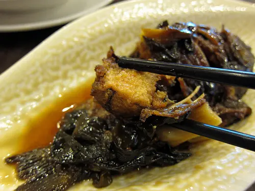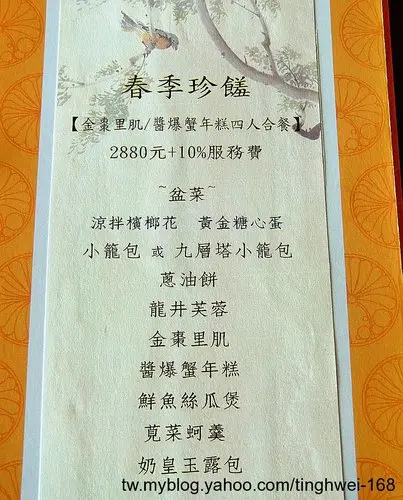 用餐日期:2013.11.18好像小籠包食記一定會有這個畫面喔!今天T陪長輩來吃飯,坐下來先點一壺凍頂烏龍茶。(茶水算人頭NT$30+10%/一人)然後翻開點水樓的菜單,這裡的招牌菜實在太多。尤其是看到深受饕客好評的讚岐牛肉麵(NT$580+10%)實在很心動,可是我們兩個人,如果點上這一碗;哪還裝得下其它的想吃菜單呢!?最後還是屈服於小份量的多選擇,唉~吃中餐還是人多好點菜。冷盤蔥焅鯽魚(NT$220+10%)一定偏甜但是可以不用吐魚刺的江浙名菜,滿肚子的魚卵是我們上了年紀的人多少有點顧忌的部分......話才說完馬上再夾一筷子,嗯~好吃。小籠包小份(NT$110+10% / 5小顆/ 平均一口NT$24.2)下墜的小籠包裡面抱著大半的湯汁,就是消費者期待的美好鮮滋味~只是……這小籠包怎麼這麼小一顆呀!(這是正常尺寸嗎?難道是我太久沒吃小籠包嗎?)好像小籠包也一定會有上面這樣的畫面!好不負眾望的讓裡面飽滿的豬肉湯汁,油膩膩、香噴噴又燒燙燙的燙出嘴皮泡,然後在滿意的豬肉油香中咕嚕滑下肚。蟹粉小籠包小份(NT$240+10%/ 5小顆 / 平均一口NT$52.8)別問我為什麼蒸籠裡多一小坨麵粉?!免不了又要來一個經典亮相照~顏色黃一點的蟹粉小籠包可是比豬肉小籠包貴上一倍還多的價格,蟹黃的鱻香當然得搶先竄出來讓人滿意;再讓裡面飽滿的豬肉油湯,油膩膩、香噴噴又燒燙燙的燙出嘴皮泡,然後在滿意的鱻香滋味中咕嚕滑下肚。我想拿開店家的品牌迷思,各家的小籠包品質已經難分軒輊了喇~煎蘿蔔糕(兩塊NT$120+10%),這種切法不常見。不過煎得恰恰已經先有基本分!外面恰恰裡面綿軟正是這種厚切才有的雙重享受喔!這蘿蔔糕~好~吃~!而且清甜全然來自白蘿蔔的天然;是不含味精的單品(因為想買所以問過)今天百貨公司周年慶最後一天,點水樓的蘿蔔糕買一送一(一份NT$200),吃得滿意;免不了一份入袋喽!一樣買一送一的三丁包(也是招牌之一~吼你們會不會太多招牌菜色了啊!)打聽後因添加味精而作罷。紹興醉雞(小份NT$420+10%)一整隻切塊的大雞腿,雖說酒香輕淺不過倒也肉嫩輕甜。炒水蓮(小份NT$360+10%)輕脆多汁的水蓮正當季。接下來的兩道都是我家長輩的專屬:這是東坡肉(一盅NT$290+10%)這是瘦肉朝上的模樣~服務生會在上桌亮相後再端下去一切為四,方便客人食用。這ㄉㄨㄢ~ㄉㄨㄢ~的三層肉……我還不懂欣賞的一種美味,拍拍照就好!清燉牛筋湯(一盅NT$220+10%)使用台灣牛筋燉煮(使用在地食材~讚!)我舀起一塊來亮相~好滑好軟嫩喔~只見我家長輩喝得滿口生香大讚好喝喔!唉~吃中餐還是人多好點菜,我們最後還打包了呢!點水樓SOGO百貨(復興館11樓)台北市大安區忠孝東路三段300號11樓 / 02-87725089日~四11:00~22:00/五~六11:00~22:30…Read More