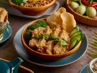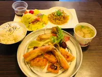 唐揚炸雞 黑胡椒牛小排 蒜酥鮮蝦 鹽烤鮭魚肚