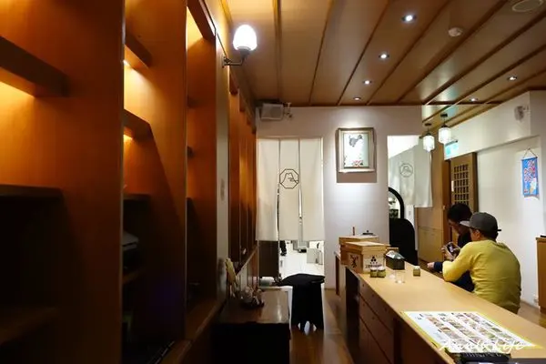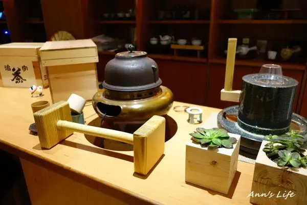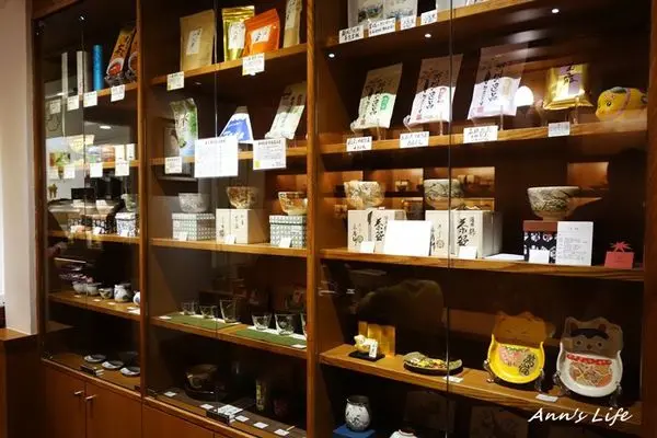 我對櫥窗裡擺放的器物很好奇,坐定點完餐後馬上起身去參觀,那些店家蒐集的頂級抹茶碗可是要價新台幣四千多~一萬多不等,還有各種品牌、包裝精美的煎茶、焙茶、抹茶等等,看得我每一款都心動的想要入手,又擔心自己的技術不佳會毀了那些好茶。