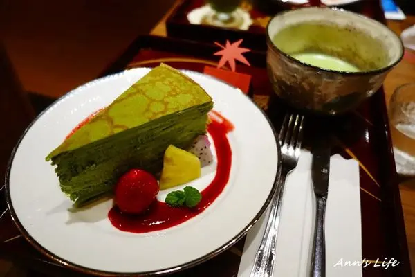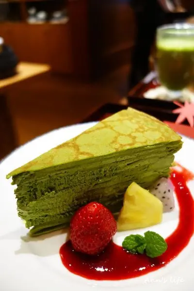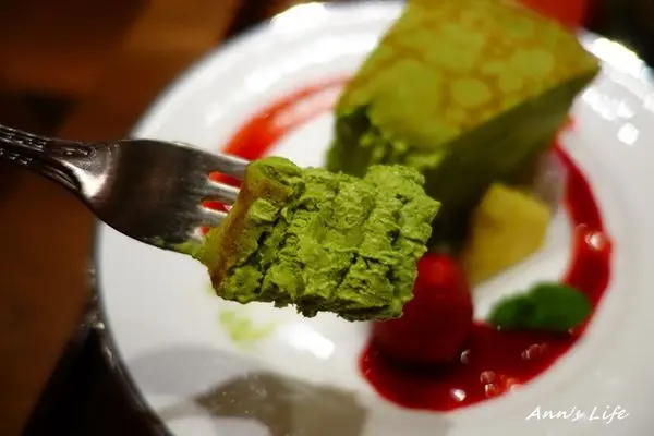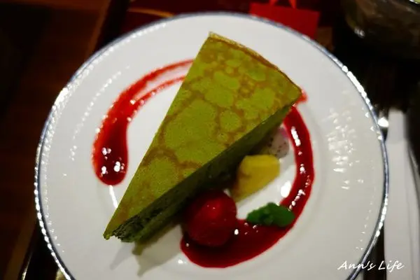 抹茶千層蛋糕一如預期中的美味,而且比起方才的抹茶蛋糕卷抹茶味更重,抹茶特有的苦也較為明顯,我很喜歡千層蛋糕口感的層次和夾層裡濃滑的抹茶卡士達,只是卡士達太濃厚相對的吃到最後也是覺得有點膩,此時盤中點綴的水果和莓果醬便發揮了效用,搭配著莓果醬的酸甜,大大降低了抹茶千層的膩感。