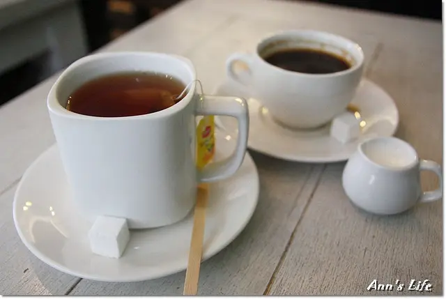 熱紅茶+熱咖啡早午餐的附餐飲料我們選擇先上,一貫的熱紅茶和熱咖啡,紅茶是用立頓茶包可回沖,咖啡則附上新鮮熱牛奶,比奶球更健康,比較引起我們注意的是盤子上的一塊小方糖,現在外面的咖啡廳已經蠻少見到使用方糖,在這裡,方糖又特別和店名連上關係挺有意思,為此,平常喝茶不加糖的我還和J一人溶了半顆糖加在飲料裡,不會太甜,很好。