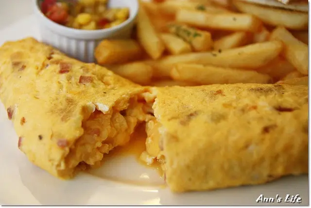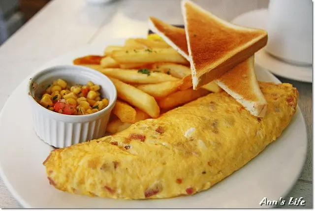 活力歐姆蕾蛋捲 $280明明有那麼多的brunch選項,繞了一圈還是沒創意的選了歐姆蕾蛋捲,沒辦法,我實在無法抵抗飽滿澄黃的蛋捲裡夾上滿滿起司和配料,方糖的歐姆蕾有三款,我選的活力歐姆蕾裡有火腿丁、培根丁、洋蔥、切達起司、馬茲瑞拉起司,還附上一小碗的香甜玉米粒及薯條和烤吐司,這裡的薯條真是好吃,炸的十分脆口,而且擺久了酥脆度也不太受影響,吐司也是我喜歡的焦脆,只可惜這裡的吐司特別薄,我喜歡市售的那種厚度,吃起來會比較有口感,但瑕不掩瑜啦。