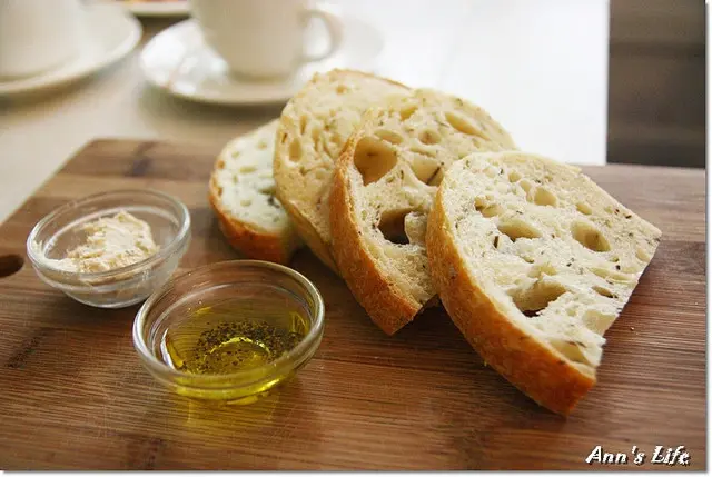 J看完menu還無法決定要點哪款,所以授權我可以選兩種自己喜歡的主餐,除了本來就內定的歐姆蕾之外,在看到menu上寫到方糖的歐式麵包經過18小時天然老麵發酵,無添加任何人工香料且每日限量後,就馬上決定是它了!任何女人都抵擋不了「限量」招喚啊,很喜歡麵包整齊排放在木板上的樣子,總覺得好像特別好吃,而且還附上了兩種搭配醬料,分別是鮪魚醬和油醋醬,看麵包的氣孔發的那麼大,就知道品質不錯,口感更是特別,不是想像中的鬆軟,彷彿吃得到一絲絲的纖維一樣,很實在。