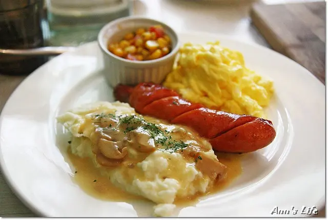 培根、火腿和帶骨香腸三選一,我選了沒吃過的帶骨香腸,腸衣脆且煙燻味香,果然如傳說中的好吃,蛋的部分也可以隨喜製作,比起太陽蛋當然還是滑嫩的炒蛋優,馬鈴薯系列也有薯條、現刨薯餅、薯塊和馬鈴薯泥可選擇,熱愛馬鈴薯泥的J毫不猶豫的選了它,這裡的薯泥通過龜毛J的認可,綿密到吃不出顆粒,淋上奶油蘑菇醬後又有濃郁奶味,不管是麵包還是早餐盤都有足以令人喜愛的魅力。