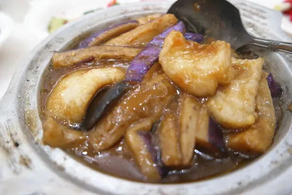 紅燒茄子斑腩褒裡面有冬粉,茄子燉煮軟爛,整個味道都浸漬在裡面,魚肉也很鮮美。很怕太油,這一頓吃完不知又要胖了幾公斤了