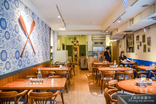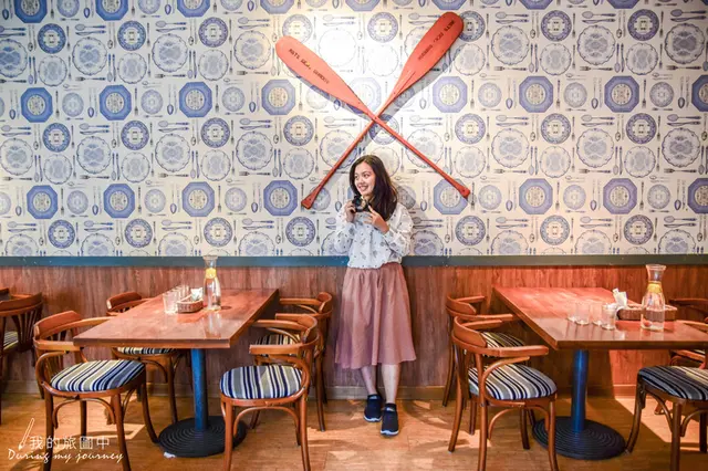 最吸睛的是牆壁上X形的船槳,還有充滿藍色餐盤的趣味壁紙,於是我們趁著三樓沒人的時候拍了好多張照片。