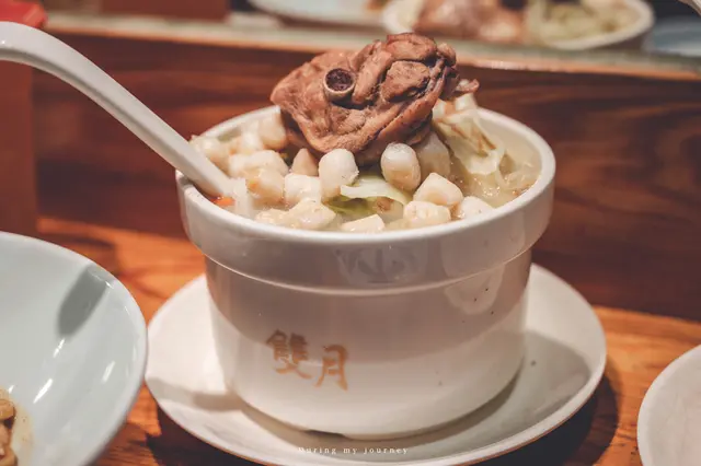 已經不是第一次品嘗雙月食品社的雞湯了,還記得第一次看到雞湯上桌時,眼睛差點凸了出來(笑),內心直呼「料也太滿了吧!」難怪雞湯成為雙月食品社的招牌;阿甘剝皮辣椒雞腿湯使用新鮮溫體仿土雞腿肉烹煮,加入嚴選的剝皮辣椒,搭配清脆的高山高麗菜,用料誠意十足,很喜歡這種甘甜微辣的口感,雞腿肉鮮美結實,吃得出食材的新鮮度,整體相當清爽開胃。