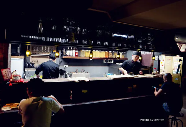 門司燒的空間其實不大,除了開門進來後有個往窗戶外看的長桌以外,正中間的用餐區及左側的區塊,再來就是面對吧臺及吧臺後面的位置,再來也有一個適合六位人數的小包廂。