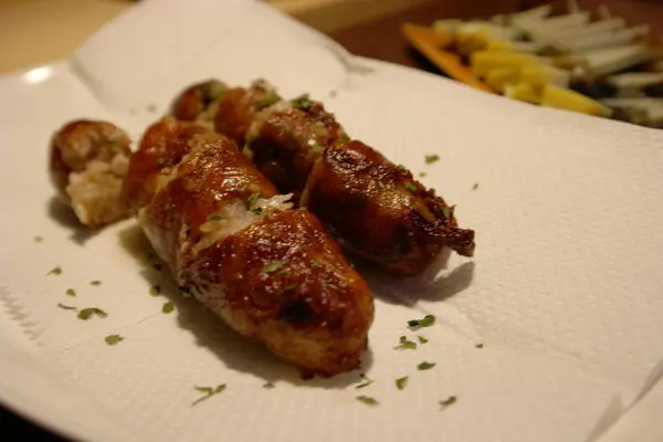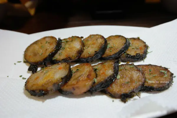 吃起來肉香飄逸,口感層次多變(有點像是羅東夜市賣的肉捲),裡面加了荸薺所以咬起來有脆脆的口感,並且加上新鮮魚漿及蝦丁,外膜裹的是豬的橫隔膜,還不趕快來嚐鮮!