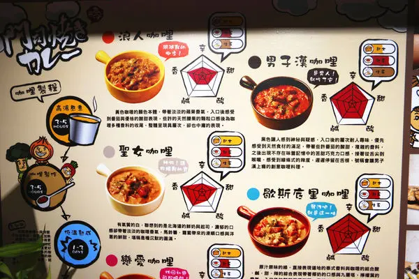 男子漢咖哩主要使用巧克力搭配辛香料,屬於辣度較高的咖哩,而浪人咖哩加了蘋果與蕃茄混搭優格,也加了一些腰果;聖女咖哩則有奶香與起司的香濃口感,戀愛咖哩則加入香蕉、蘋果、鳳梨呈現出不同的果香調和,有如戀愛般的甜蜜滋味,屬於較清爽的果香咖哩。