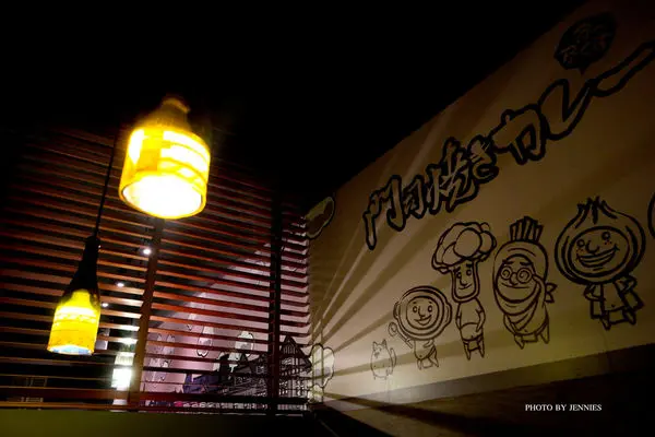 牆壁上的繪圖也是團隊設計,分別代表咖哩食材-洋蔥 花椰菜 胡蘿蔔 馬鈴薯狗 台梗九號米 焗烤先生(目前未放入的食材是花椰菜,主要是因為烤過後口感不佳)。
