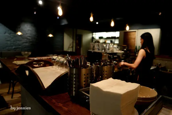 餐廳內的空間流暢,開放式的吧檯設計貼近與人之間的距離,而料理廚房在角落一隅,看得到廚房裡的忙碌與用心工作的景象。
