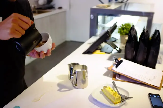 當天正在進行咖啡教學,學員們一個個站在吧台裡專心盯著咖啡師的每一個步驟。