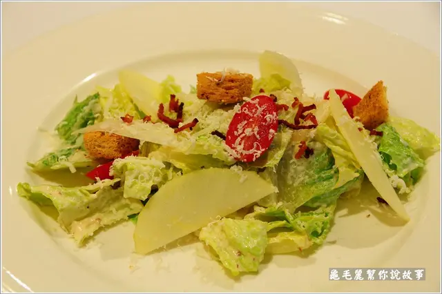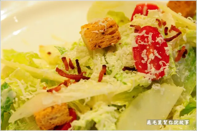 跟一般外面吃到滿滿淋醬的凱撒沙拉不同,它是先拌過再擺盤,