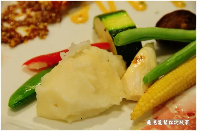 配菜是櫛瓜、磨菇、玉米筍、芋泥和四季豆,我本來超期待可以吃到千層芋泥,
