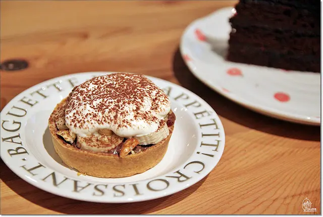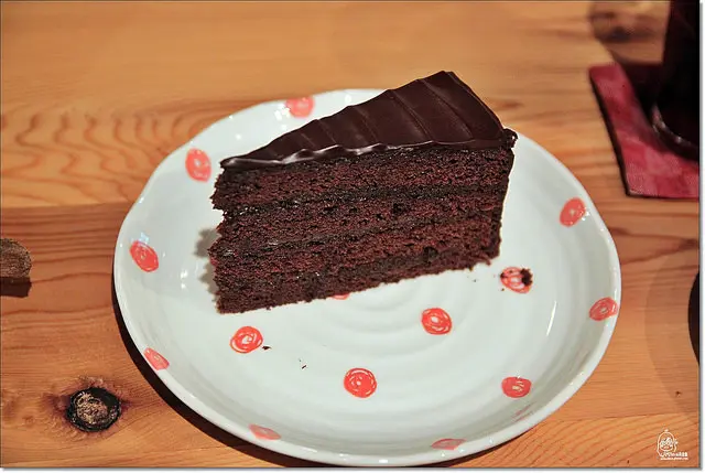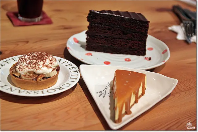 是典型的美式Layer cake。就像惡魔一樣邪惡的外觀,選用的是73%苦甜巧克力,風味香濃而不甜膩,尤其是蛋糕體的口感非常濕潤。特別的是在蛋糕體的中間淋上薄薄的焦糖,因為73%的純度,還是有點微苦,淋上薄薄的焦糖可以平衡巧克力的苦味,製造蛋糕的層次感。愛巧克力的人可以點來吃吃看,怕太甜膩的朋友其實也可以嘗試,因為這巧克力純度很高,所以偏苦甜,對於我這不愛太甜膩的人來說很剛好。