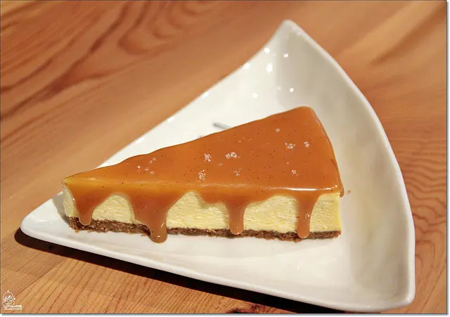 採用New York style的重乳酪蛋糕,這款重乳酪蛋糕特色就是口感濃郁、紮實。底部為使用全麥麵粉自製的消化餅乾。再淋上手工熬煮海鹽焦糖醬,甜而不膩,因為有加入海鹽一起熬煮的焦糖醬,吃起來甜中帶鹹,很有層次。最後再灑上鹽之花,使風味更佳。