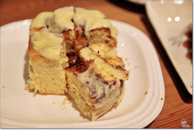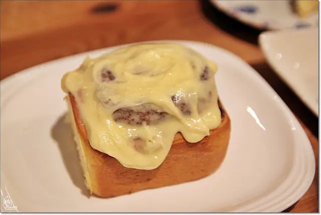 Miss V的肉桂捲就是跟外面賣的不一樣,是因為使用大量的蛋黃製作的肉桂捲,口感近似於蛋糕。一般害怕肉桂粉的人是因為那刺鼻的獨特香氣,但Miss V香甜的肉桂粉不會有刺激的感覺,因為是使用兩種不同的肉桂粉精心調製而成。讓害怕肉桂的朋友也可以因此降低對肉桂粉的排斥,最後再搭配上奶油起司抹醬,呈現出的口味為傳統的美式口味。吃起來有著起司香氣的肉桂捲還蠻特別的,很有層次的香氣。