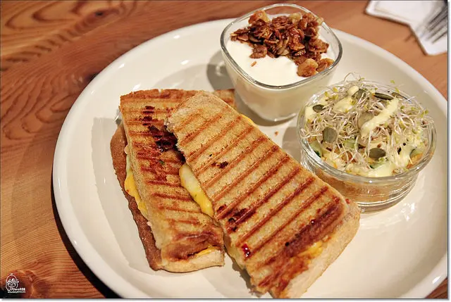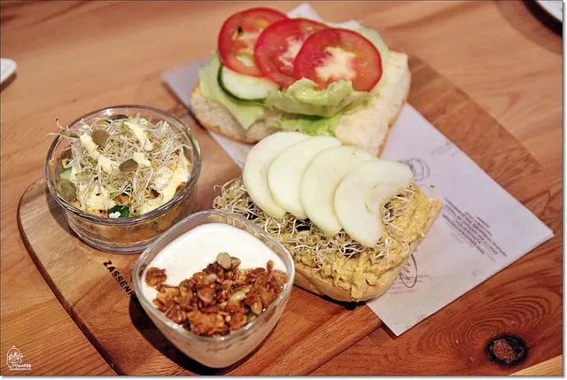 不定時推出的咖哩鮪魚佛卡夏三明治,是採用Q軟的自製佛卡夏,搭配咖哩鮪魚沙拉和爽脆的蘋果及各式蔬菜,附餐為自製蜂蜜燕麥優格和黃金費塔起司沙拉,佛卡夏有點嚼勁,我個人還蠻愛吃的,咖哩鮪魚沙拉搭配甘甜爽脆的蘋果與蔬菜吃起來口感很是清爽,非常健康取向又美味。