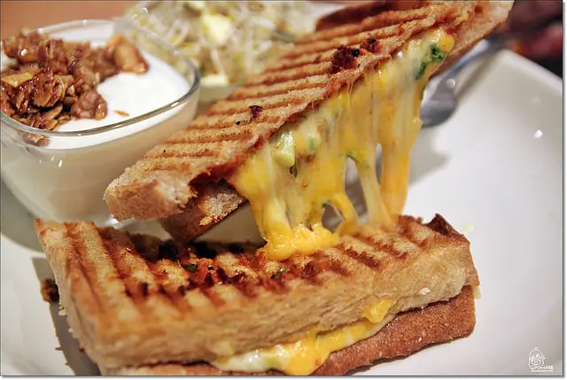 太酷了!!這是Miss V自製的Chipotle番茄辣醬,我第一次吃到番茄辣醬,覺得微辣的酸甜香氣好對味。搭配上自製的全麥鄉村麵包,內為帕瑪森、馬茲拉、切達三種起司的融合,加上香菜的特殊香氣讓風味更具層次,附餐為自製蜂蜜燕麥優格和黃金費塔起司沙拉。Miss V喜歡自製的食物,強調清爽美味少油炸的健康取向,也希望客人吃的到食物原本的味道,而且自己做也比較安心。
