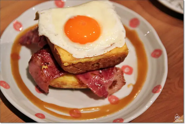 招牌肉桂捲原來可以變化多端,Miss V這次將肉桂捲浸泡橙酒蛋汁後煎至表皮金黃,外層近似於麵包布丁的口感,內部卻依然保有肉桂捲的Q彈,搭配熟度剛好的太陽蛋以及煎得恰到好處的培根,最後再淋上焦糖醬,風味甜鹹適中,就是甜中帶著培根的鹹...有點衝突的食感,創意很有,但就看大家的接受度嘍,盤子還有一圈焦糖醬,想挑戰甜鹹交融的朋友可以考慮用培根多沾點焦糖醬一起吃,但我還是比較習慣分開吃啦!哈哈哈..我個人不太喜歡衝突的口感XD!