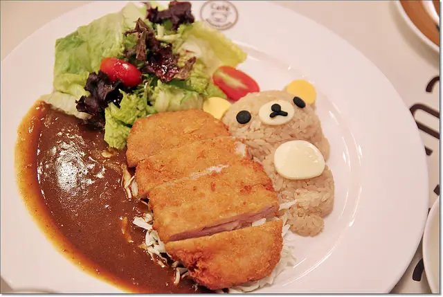 慵懶的拉拉熊躺著蹺腳這麼悠哉,旁邊是大塊豬排與咖哩,上面還有和風沙拉。
