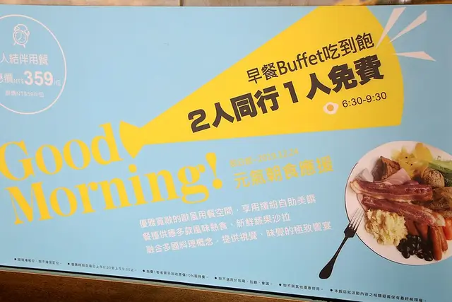 即日起到2019/12/24 早上6:30~9:30可以享用2人同行1人免費的優惠