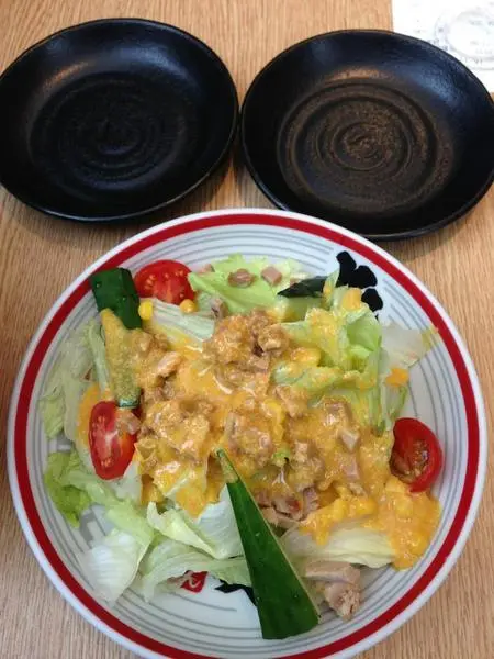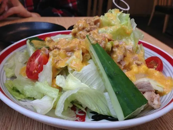 於是看完menu我和友人決定點一碗大的東京豚骨拉麵(湯頭淡一點)和一份屯京沙拉交換著吃