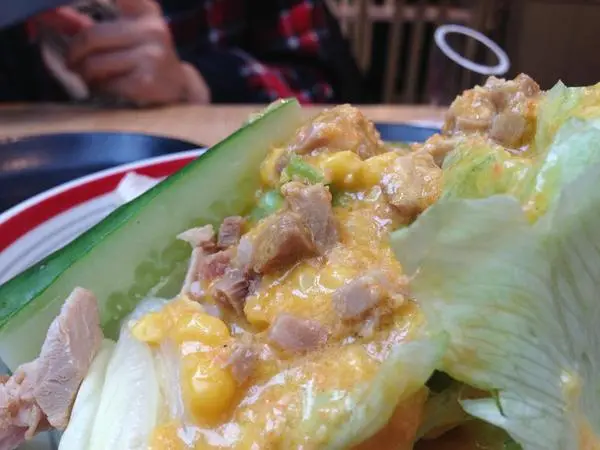 我夾了點生菜沾沙拉醬放進嘴裡...