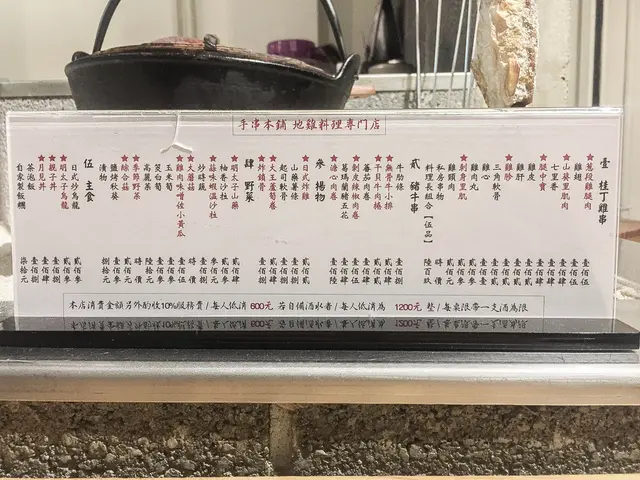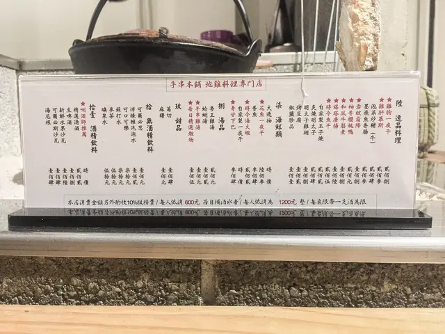 總共分為9像種類,桂丁雞串,豬牛串,揚物,野菜,主食,一品料理,海鮮類,湯品,甜品,以及酒類與軟性飲品,店家歡迎自帶美酒來增添風味,不過自帶酒類低消一人1200元。